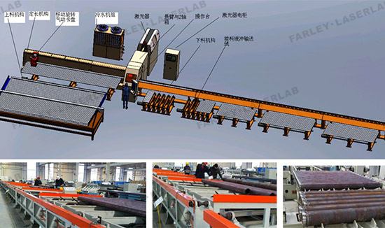 “全自動(dòng)化數(shù)控激光切管生產(chǎn)線”始于2011年3月份。基于“三一重工”全面改進(jìn)生產(chǎn)工藝,提高生產(chǎn)效率的需求實(shí)際,華工法利萊研制開發(fā)出數(shù)控激光切管系統(tǒng)(JKG9015)3臺(tái),目前3臺(tái)激光切管系統(tǒng)分別布局在三條不同的生產(chǎn)流水線上(每條線總長60米,寬10余米)。該切管線能實(shí)現(xiàn)鋼管材料從上料、輸送、定長、切割、下料、傳輸?shù)搅魉€不同下續(xù)環(huán)節(jié)等整個(gè)過程的完全自動(dòng)化。