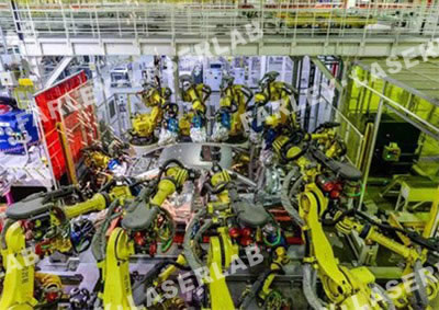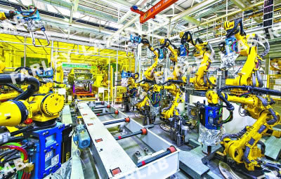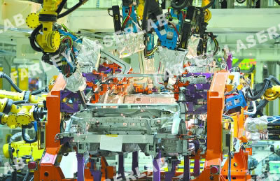 在車身車間,機(jī)器人正在進(jìn)行總拼增焊工序,該車間擁有452臺機(jī)器人,自動化率高達(dá)97%