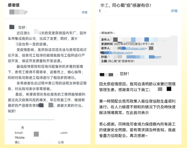 近期,全國(guó)多省份、多起疫情同時(shí)發(fā)生,牽動(dòng)人心。華工激光在特殊時(shí)期仍保持著高效優(yōu)質(zhì)的服務(wù),一封封來自各地客戶的感謝信是客戶對(duì)我們的贊許與肯定!