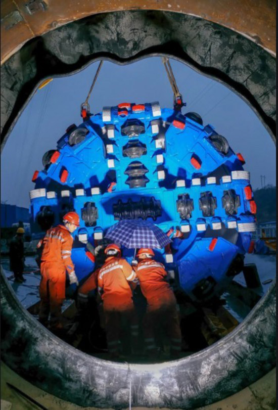 隨著軌道交通行業(yè)的迅猛發(fā)展,盾構(gòu)機(jī)作為一種隧道挖掘機(jī),起到了至關(guān)重要的作用。盾構(gòu)機(jī)主要包括了前盾、中盾、尾盾、刀盤(pán)及其他附件,而刀盤(pán)相當(dāng)于“排頭兵”,具有開(kāi)挖功能、穩(wěn)定功能及攪拌功能,是名副其實(shí)的核心部件。同時(shí),滾刀對(duì)刀盤(pán)的使用又起到了功不可沒(méi)的作用。滾刀安裝在其前端,通過(guò)推力使其緊貼巖石表面,刀盤(pán)旋轉(zhuǎn)時(shí),滾刀一邊隨著刀盤(pán)旋轉(zhuǎn),一邊圍繞自身軸心進(jìn)行旋轉(zhuǎn)。施工時(shí),若盾構(gòu)機(jī)推力小于巖石強(qiáng)度,會(huì)在巖石表面切出一系列同心圓溝槽;當(dāng)盾構(gòu)機(jī)推力大于巖石本身強(qiáng)度時(shí),巖石會(huì)被直接切碎。盾構(gòu)機(jī)破巖原理是將刀刃插入巖石,使巖石表面呈現(xiàn)放射性裂紋,隨后給滾刀施加推力,相鄰滾刀間巖石的裂紋就會(huì)延伸,從而變成碎片崩落,破巖完成。