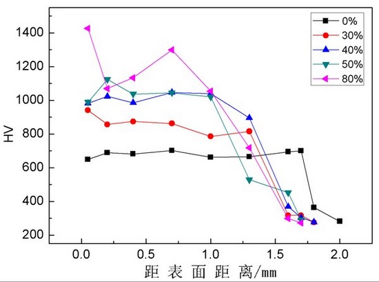 我司開(kāi)發(fā)的新型復(fù)合粉末為鐵基粉末及具有超高硬度的第二相所構(gòu)成,第二相最高硬度可達(dá)到HV2600-3200,因此,該硬質(zhì)相的加入可大大提升熔覆層的整體硬度。同時(shí),經(jīng)過(guò)對(duì)不同比例粉末進(jìn)行多次反復(fù)的試驗(yàn)研究,發(fā)現(xiàn)復(fù)合粉末在一定比例時(shí)得到的超高耐磨合金層可同時(shí)滿(mǎn)足高硬度及結(jié)合面高韌性?xún)纱髢?yōu)勢(shì),整體性能最佳。對(duì)熔覆層進(jìn)行微觀分析,發(fā)現(xiàn)其中的硬質(zhì)相比例達(dá)到了70%,耐磨層的平均硬度為HRC64以上,遠(yuǎn)遠(yuǎn)高于基材的硬度,真正做到了內(nèi)里強(qiáng)韌外表超耐磨。