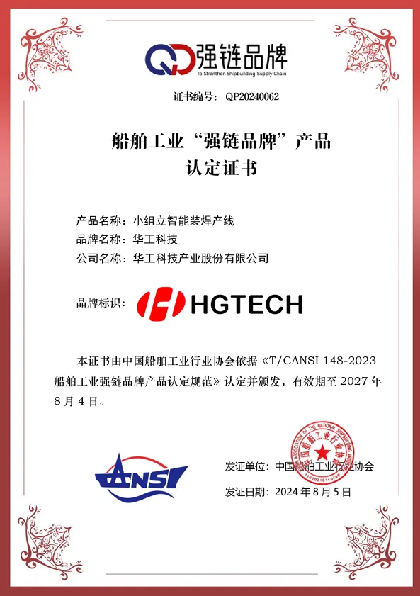 8月8日,中國船舶工業(yè)行業(yè)協(xié)會公布2024年度船舶工業(yè)“強(qiáng)鏈品牌”產(chǎn)品認(rèn)定結(jié)果,華工科技申報的“部件智能切割下料線”和“小組立智能裝焊產(chǎn)線”通過中國船舶工業(yè)行業(yè)協(xié)會的專家團(tuán)隊審查,被認(rèn)定并列入船舶工業(yè)“強(qiáng)鏈品牌”產(chǎn)品目錄。