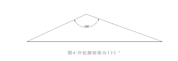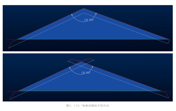 當轉(zhuǎn)角是鈍角或是超過一定角度(這個角度在編程軟件里可設(shè)置)的時候,切割頭可以直接通過旋轉(zhuǎn)達到相鄰線段所需角度。如圖4所示,對于135 °的外輪廓,當我們在軟件里面設(shè)置好轉(zhuǎn)角回路閾值,在出程序時,就可以決定我們是直接成型,還是重新打孔加引線兩次成型。