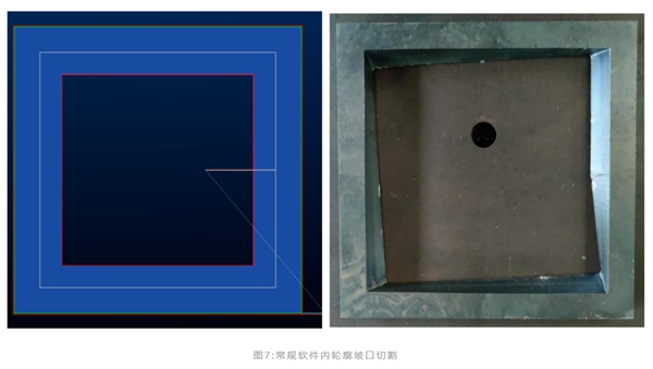 但實際切割時可以發(fā)現(xiàn),轉(zhuǎn)角處切割頭旋轉(zhuǎn)速度很慢,不能立刻旋轉(zhuǎn)到相鄰邊所需的角度,導致切割頭一邊切割一邊旋轉(zhuǎn),最終形成了漸變坡口的成型狀態(tài),無法滿足加工需求。實際上,內(nèi)輪廓90°轉(zhuǎn)角坡口切割一直是行業(yè)難題,因為常規(guī)軟件不能準確計算出切割頭轉(zhuǎn)角運動時的G代碼,所以內(nèi)輪廓轉(zhuǎn)角切割也一直沒有得到很好解決。