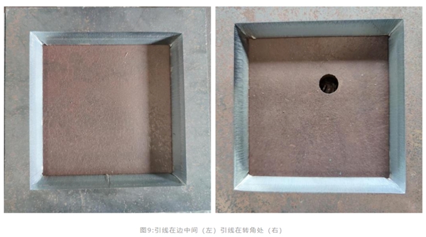 在實際切割過程中,內(nèi)輪廓的轉(zhuǎn)角處切割頭可以快速轉(zhuǎn)到相鄰邊所需角度,切割過程中,保證每個邊的坡口角度一致,并且轉(zhuǎn)角處成型良好。圖9為10mm鐵板內(nèi)輪廓轉(zhuǎn)角切換狀態(tài),將引入線放到內(nèi)輪廓轉(zhuǎn)角處,可以看到內(nèi)輪廓4邊坡口角度一樣且切割面質(zhì)量更好,無引線痕跡。