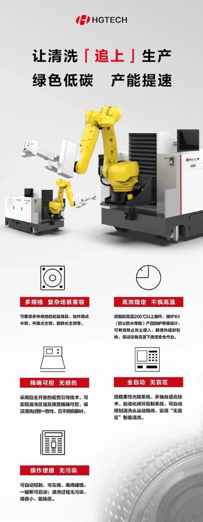 華工科技自主研發(fā)的“輪胎模具激光清洗智能裝備”攻克了激光器、清洗頭、視覺(jué)引導(dǎo)技術(shù)等多項(xiàng)核心部件與工藝,無(wú)懼高溫“烤驗(yàn)”,“不拆?!币材茏屛酃敢粧叨猓羁?5分鐘即可在線(xiàn)清洗一副輪胎模具,可有效解決傳統(tǒng)清洗方式中“待機(jī)時(shí)間長(zhǎng)、反復(fù)拆卸、模具磨損、清洗不徹底、環(huán)境污染、能耗高”等痛點(diǎn)、難點(diǎn)問(wèn)題,從而減少硫化機(jī)停機(jī)時(shí)間,提高生產(chǎn)效率及輪胎質(zhì)量,開(kāi)啟了輪胎模具清洗“低碳、自動(dòng)化”新時(shí)代。