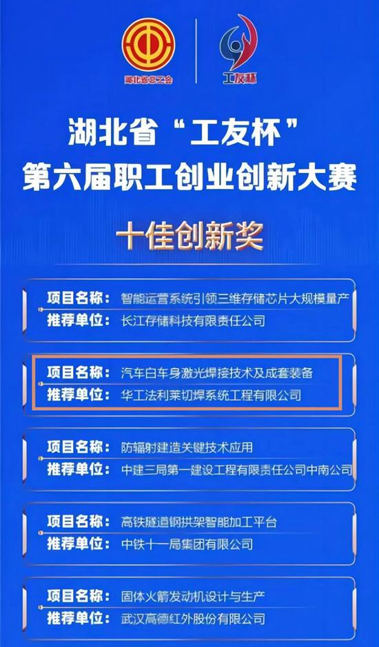 近日,湖北省第六屆“工友杯”職工創(chuàng)業(yè)創(chuàng)新大賽決賽結(jié)束。華工科技核心子公司華工法利萊選送的汽車白車身激光焊接技術(shù)及成套裝備項目,獲“十佳創(chuàng)新獎”第二名。