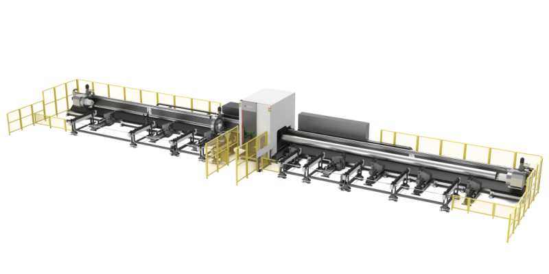 全自動伺服控制上料架、高精度超長床身、高精度回轉(zhuǎn)卡盤、浮動支撐翻板下料機(jī)構(gòu)、全自動伺服控制下料架、人機(jī)工程安全防護(hù)裝置等,可實(shí)現(xiàn)超長超重管材的激光全自動加工生產(chǎn)。