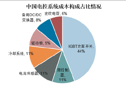 電控系統(tǒng)是新能源汽車的“大腦”,控制整個車輛的運行與動力輸出,主要由逆變器、逆變驅(qū)動器、電源模塊、中央控制模塊、軟起動模塊、保護模塊、散熱系統(tǒng)信號檢測模塊等組成,其中逆變器負責蓄電池的直-交轉(zhuǎn)換,從而驅(qū)動電機運轉(zhuǎn)。其中IGBT功率半導體模塊應用于逆變器中,是新能源汽車電控系統(tǒng)和直流充電樁的核心器件,被稱為電力電子的“CPU”,占整個控制器成本的40-50%左右。